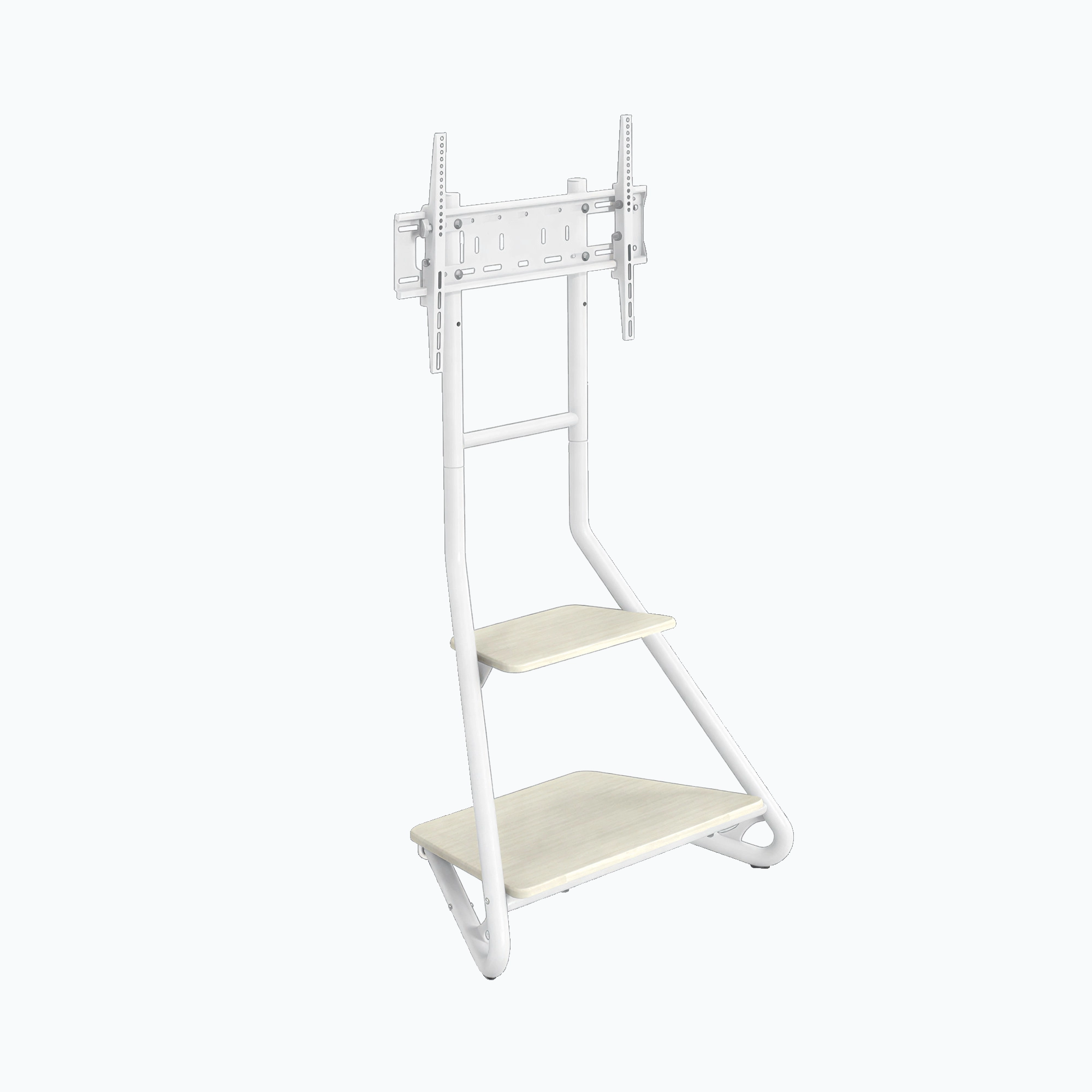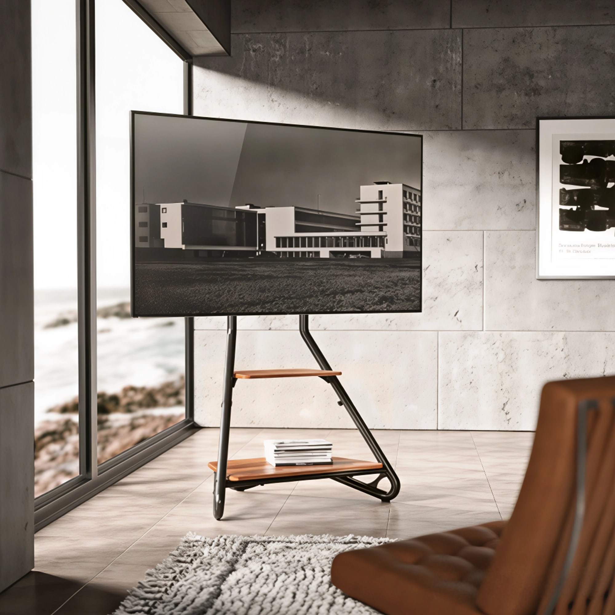 A modern Bauhaus-style corner TV stand featuring a geometric metal frame and 2-tier wooden storage shelves, blending art-inspired aesthetics with practical storage for elegant and functional living spaces.