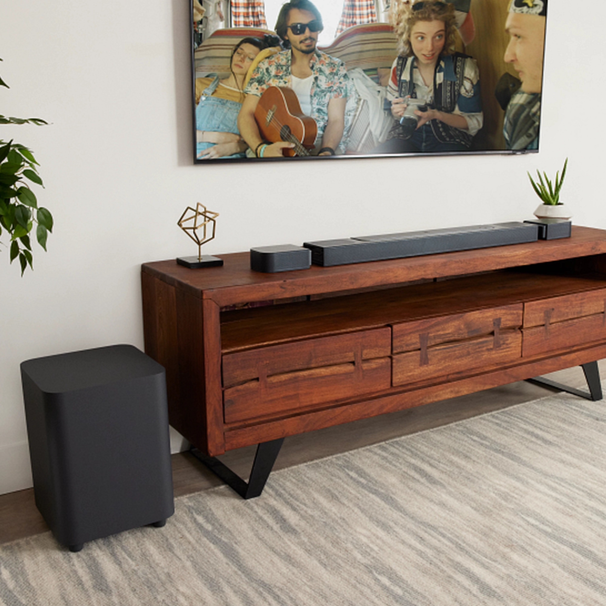 Experience true surround sound with the JBL Bar 800, equipped with Dolby Atmos and detachable wireless rear speakers for immersive 3D audio. The powerful wireless subwoofer adds room-shaking bass, while PureVoice technology delivers crisp, clear dialogue.