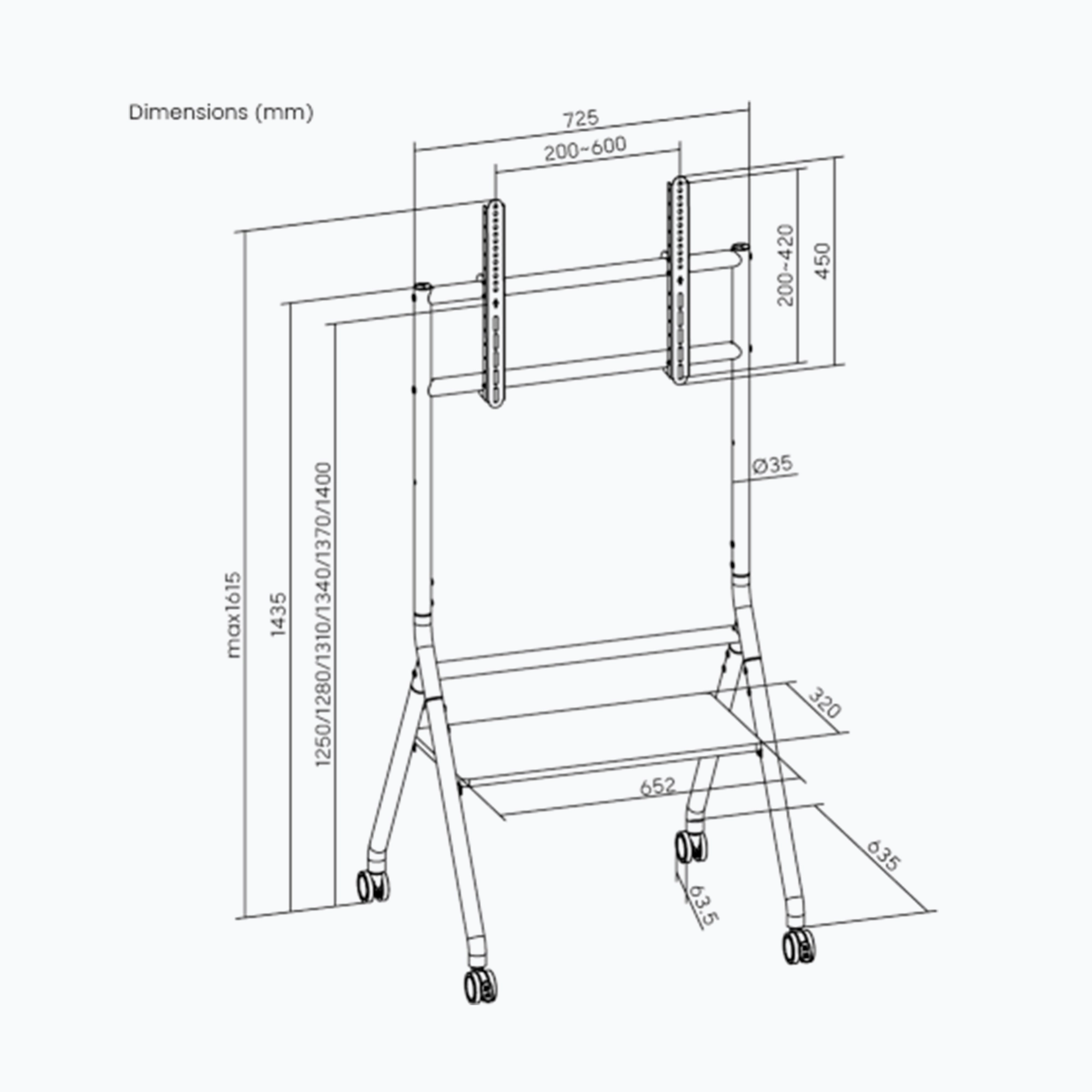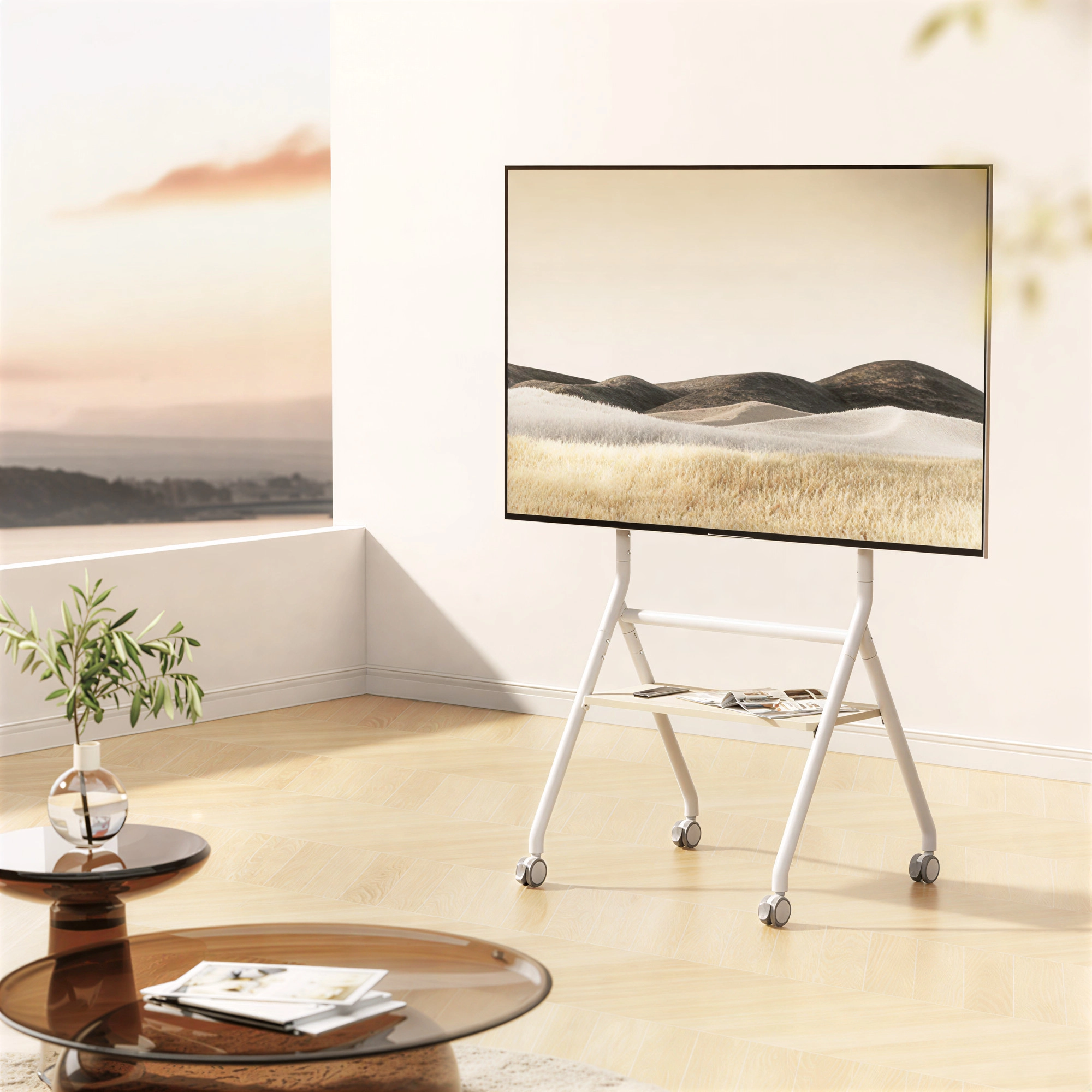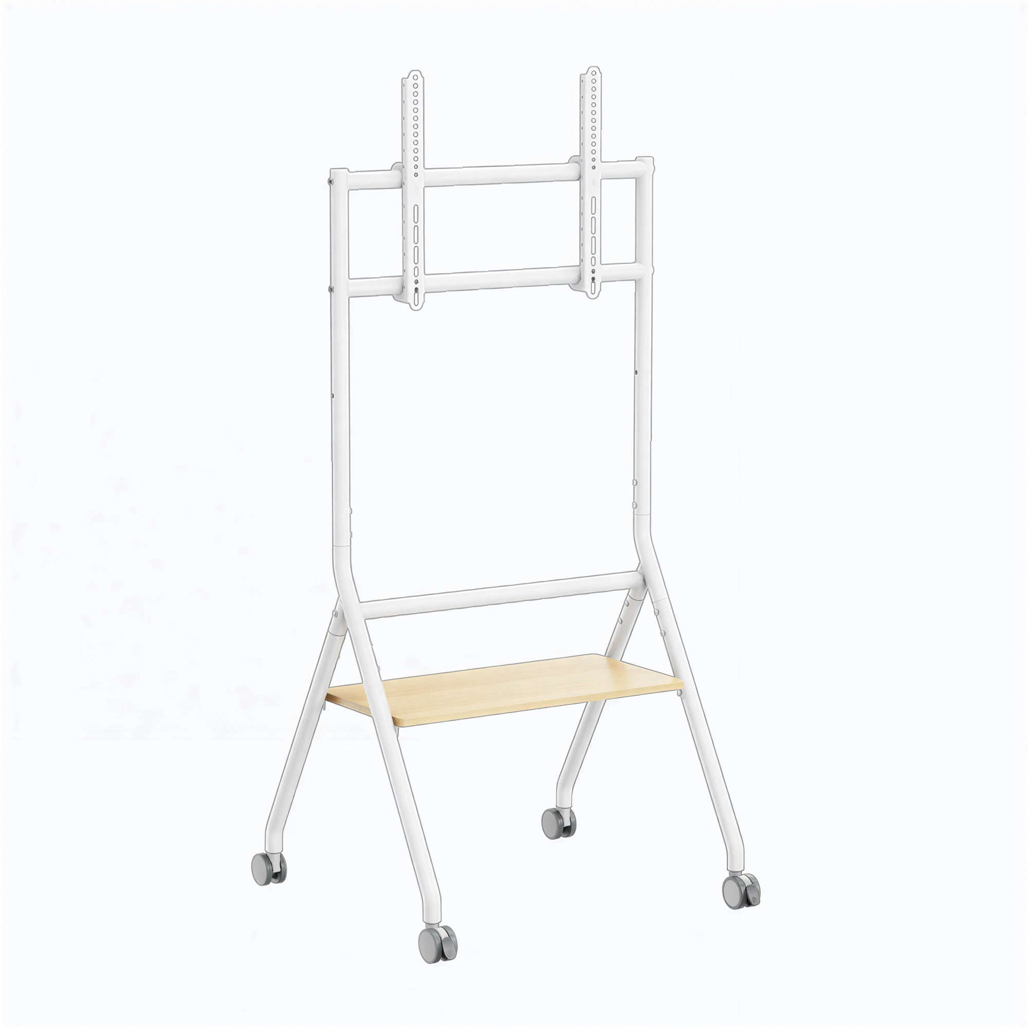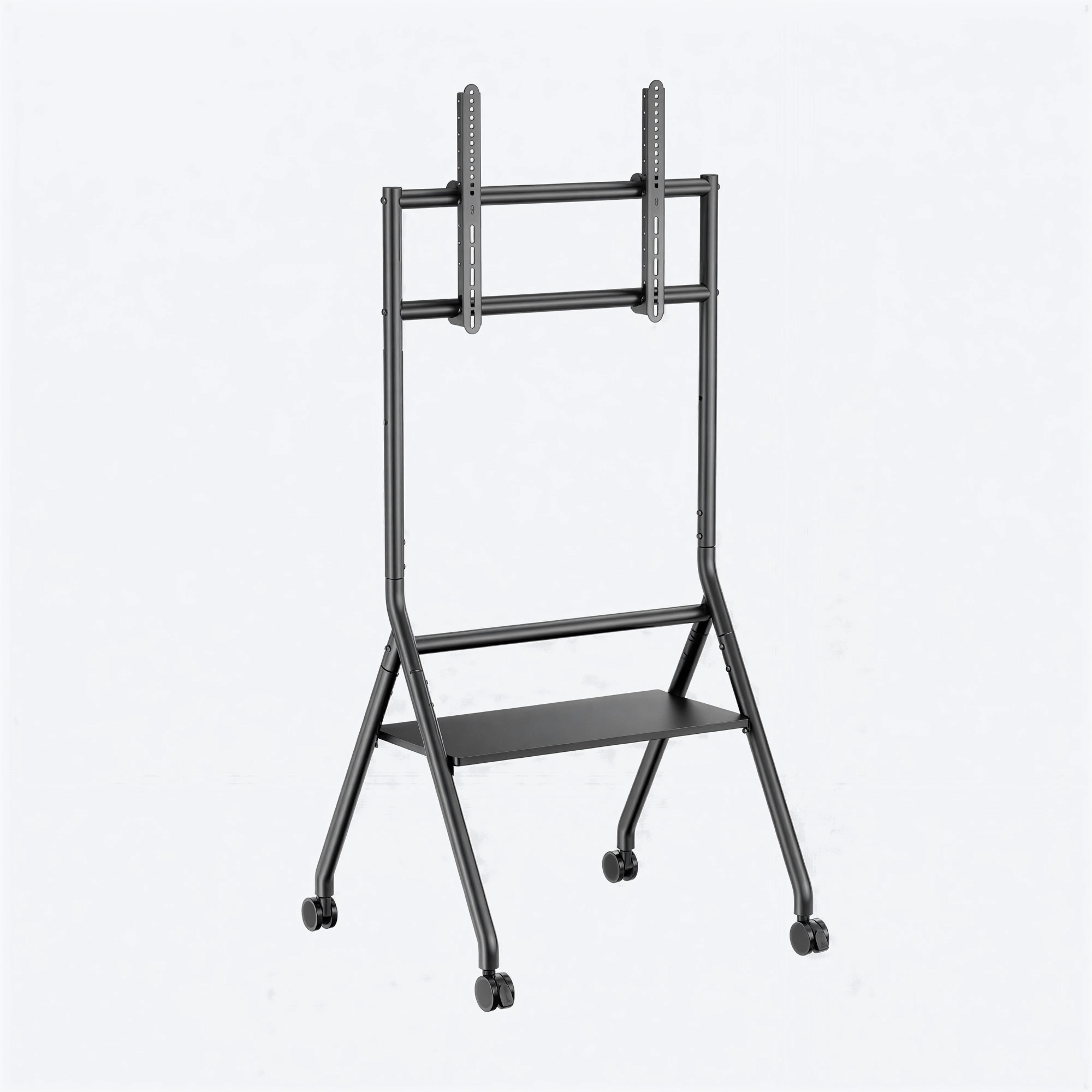 A sleek, heavy-duty studio TV cart featuring adjustable height, a strong load-bearing frame, smooth-rolling, durable casters, and a built-in storage shelf, delivering both mobility and minimalist design for collaborative and professional environments.