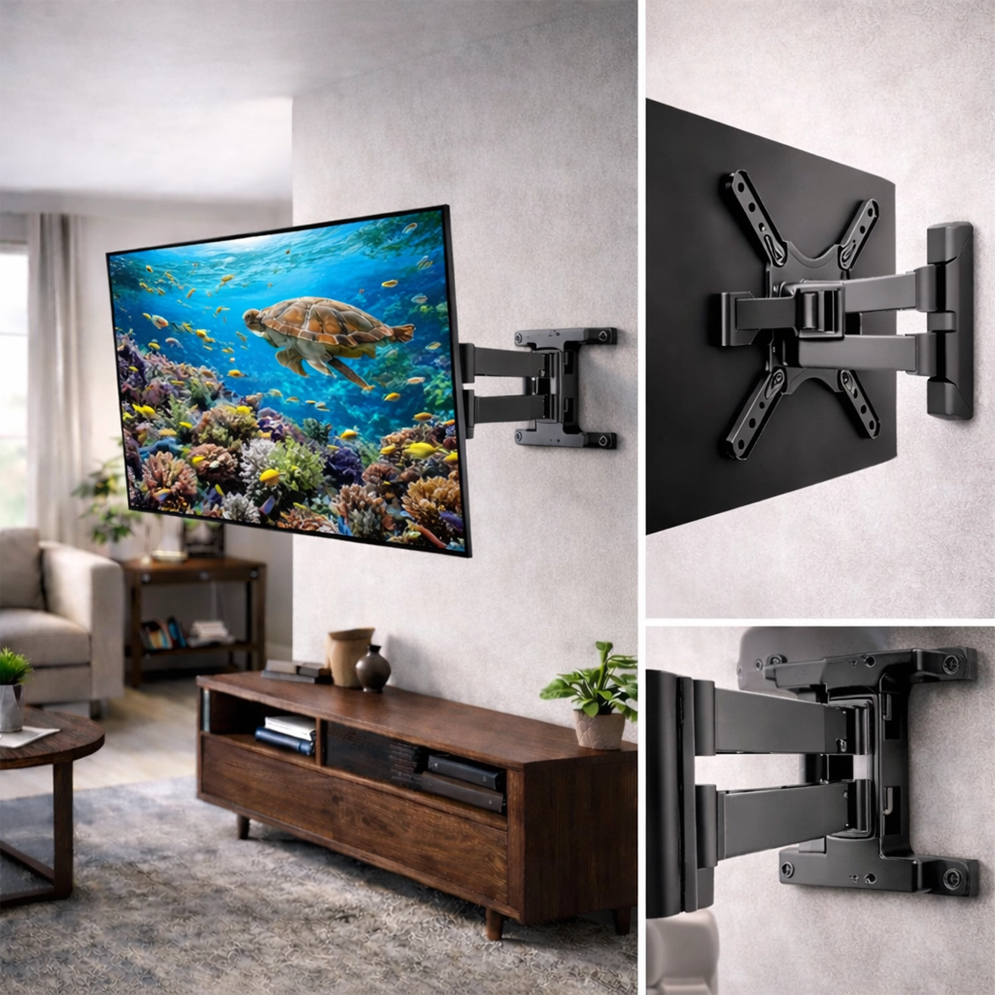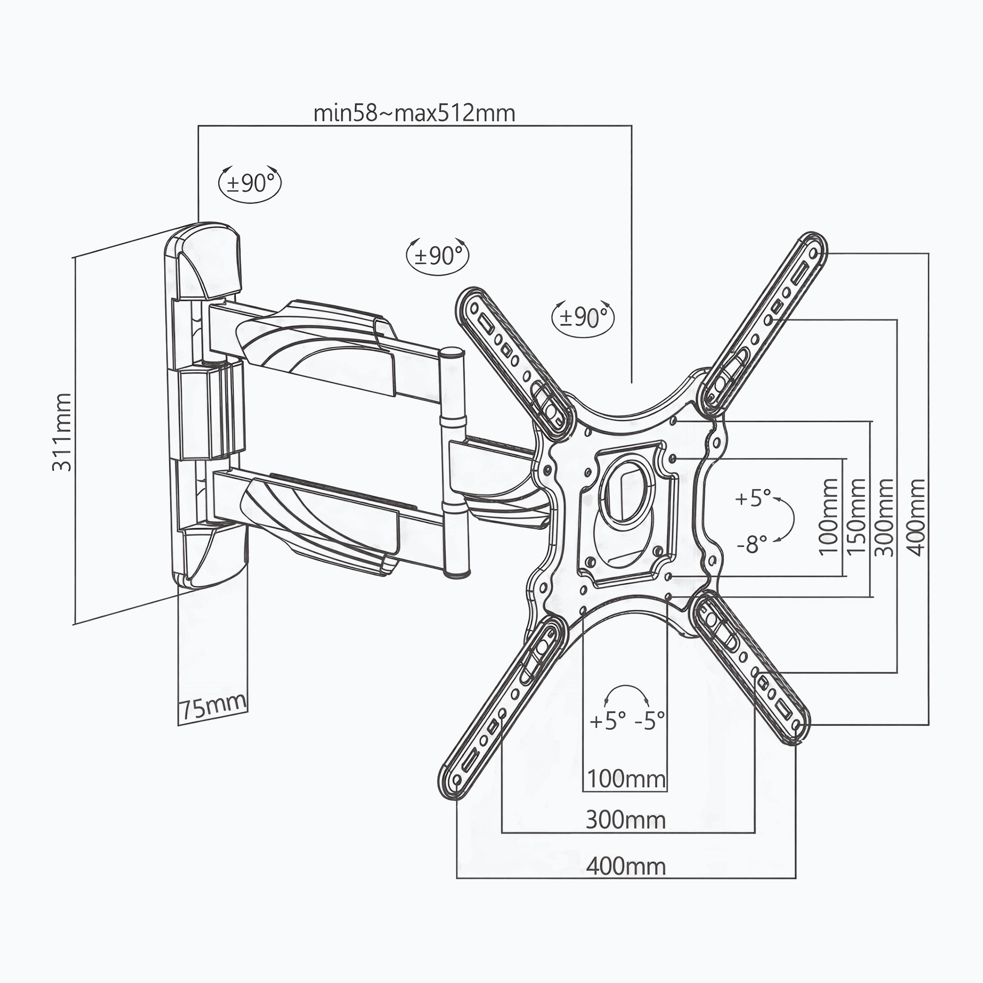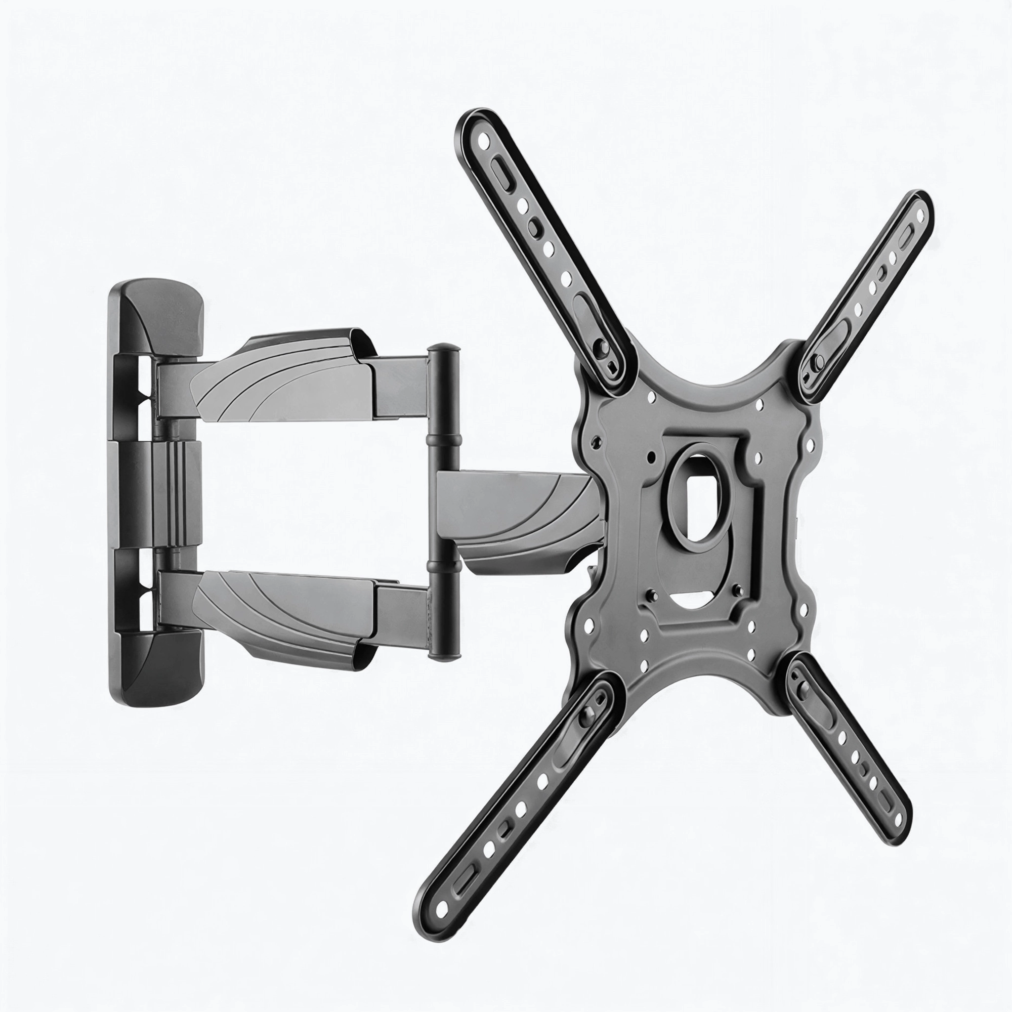 A stylish full-motion TV wall mount with tilt, swivel, extend, and fold functions, extending up to 503 mm for flexible viewing, plus cable management covers, ±5° level adjustment, and VESA support up to 400×400 for a clean and perfectly aligned installation.